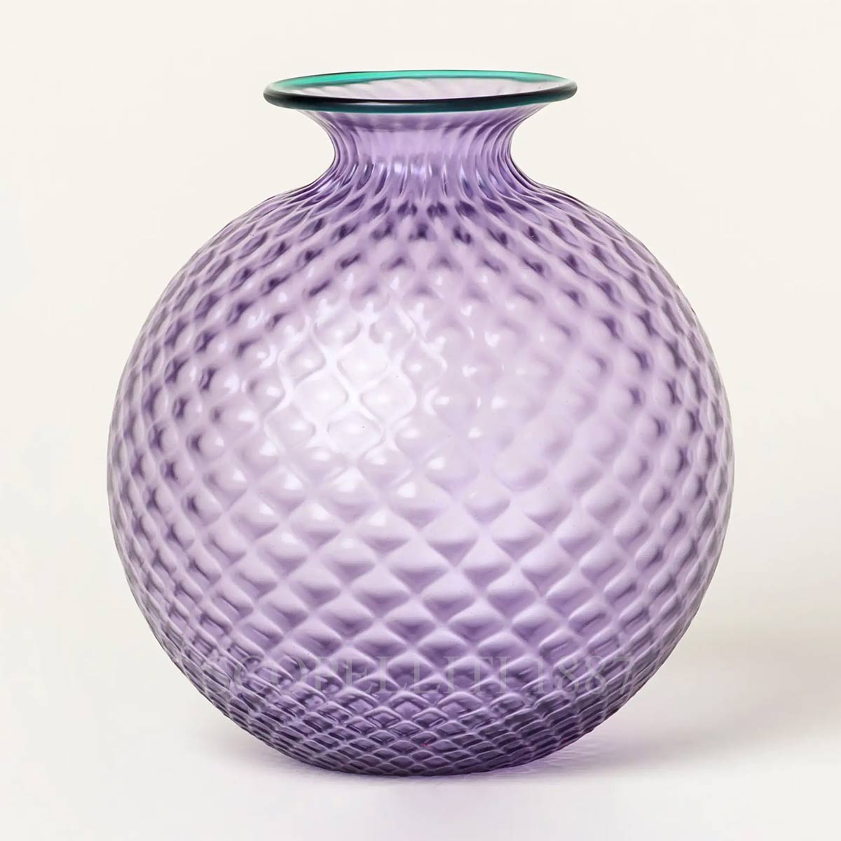 The Venini Vase Monofiore Balloton Lilac Mint Green Large is an example of handmade Murano glass. Crafted with the iconic Balloton technique, this large-format vase highlights a beautifully textured surface that reflects light in dynamic ways. The Lilac Mint Green hue offers a fresh, contemporary feel , retaining the brand’s sophisticated elegance. Designed to hold a single flower or to stand alone as a sculptural piece, this vase emphasizes simplicity, refined form, and the artistry of Murano glass.