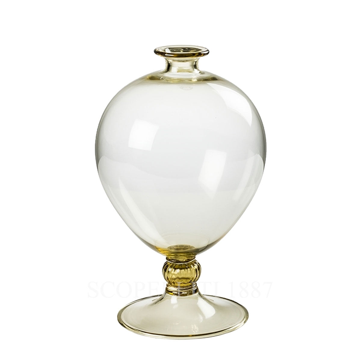 This stunning Venini Veronese straw yellow vase adds a touch of luxury and sophistication to any space, making it a true statement piece of timeless beauty and craftsmanship. This gorgeous vase or decorative object from Venini is sure to bring flair to any setting or side table. Please note that the color of the vase may vary slightly from the catalog image due to the handcrafted nature of its production. The Veronese Vase in straw yellow colour has been discontinued, so hurry up to get this beautiful vase!