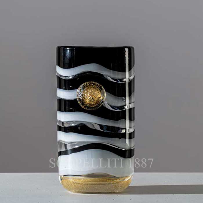 The Venini Versace Vase Gessato Limited Edition is a exclusive edition piece resulting from the collaboration between Versace and Venini, renowned for their exquisite Murano glass creations. This hand-blown glass vase features black and white horizontal stripes achieved through the “Fasce” technique, where colored glass threads are applied to the central body and coated with a fine layer of transparent glass. A distinctive golden Medusa accent, emblematic of Versace, adorns the vase.