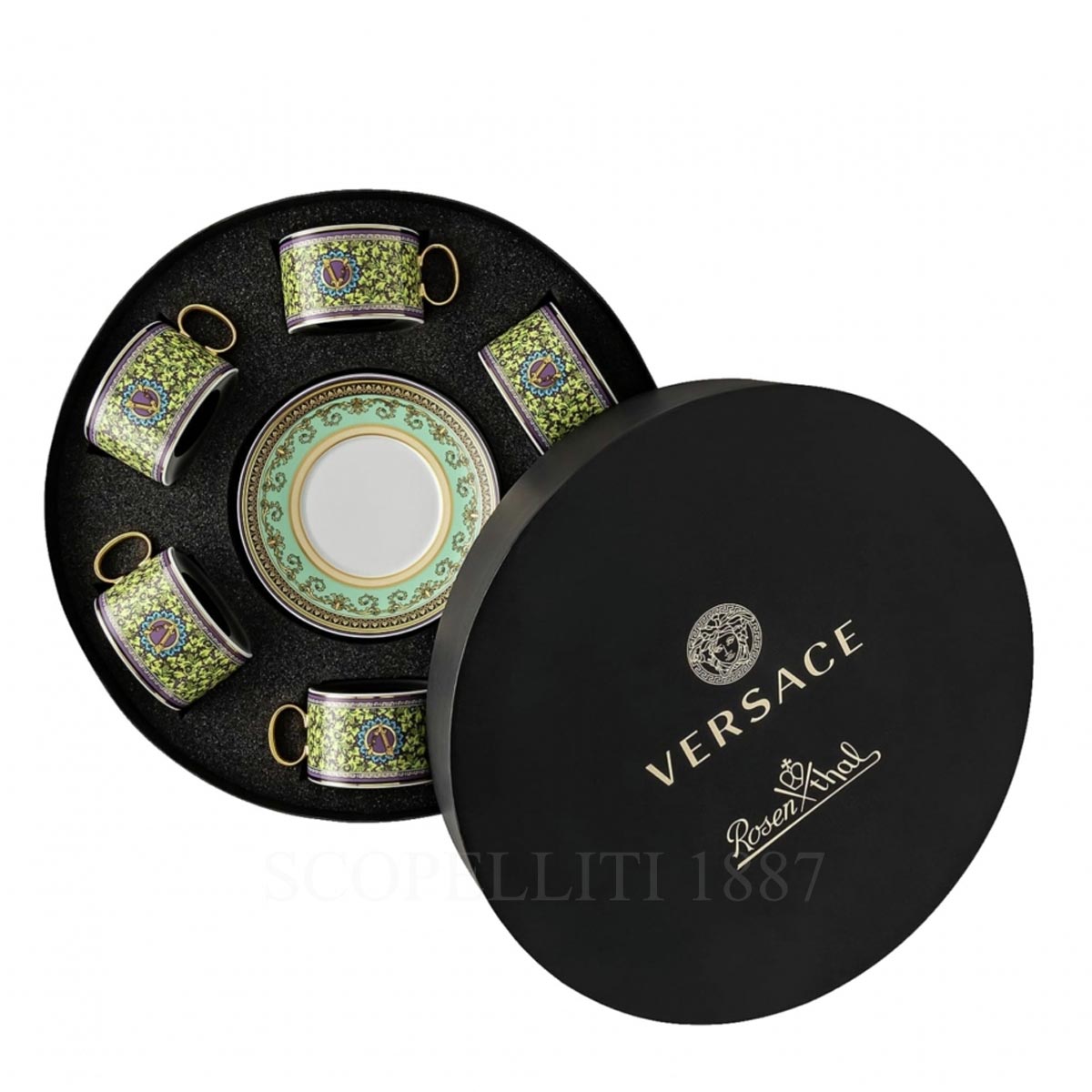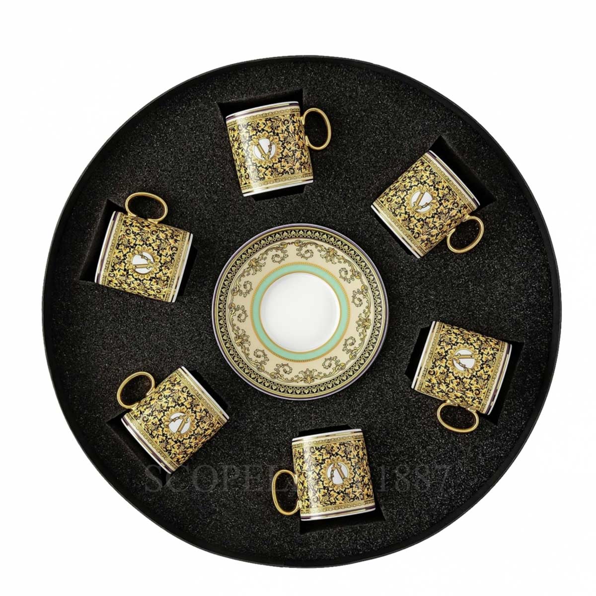 The Versace Barocco Mosaic Espresso Cups Set is a stunning collection of 12 pieces, featuring six elegant espresso cups paired with six matching saucers. This exquisite gift set comes beautifully arranged in a well-crafted and secure box, perfect for gifting or safekeeping. Perfect for entertaining or as a collector’s item, it embodies the sophistication and opulence synonymous with the Versace name.