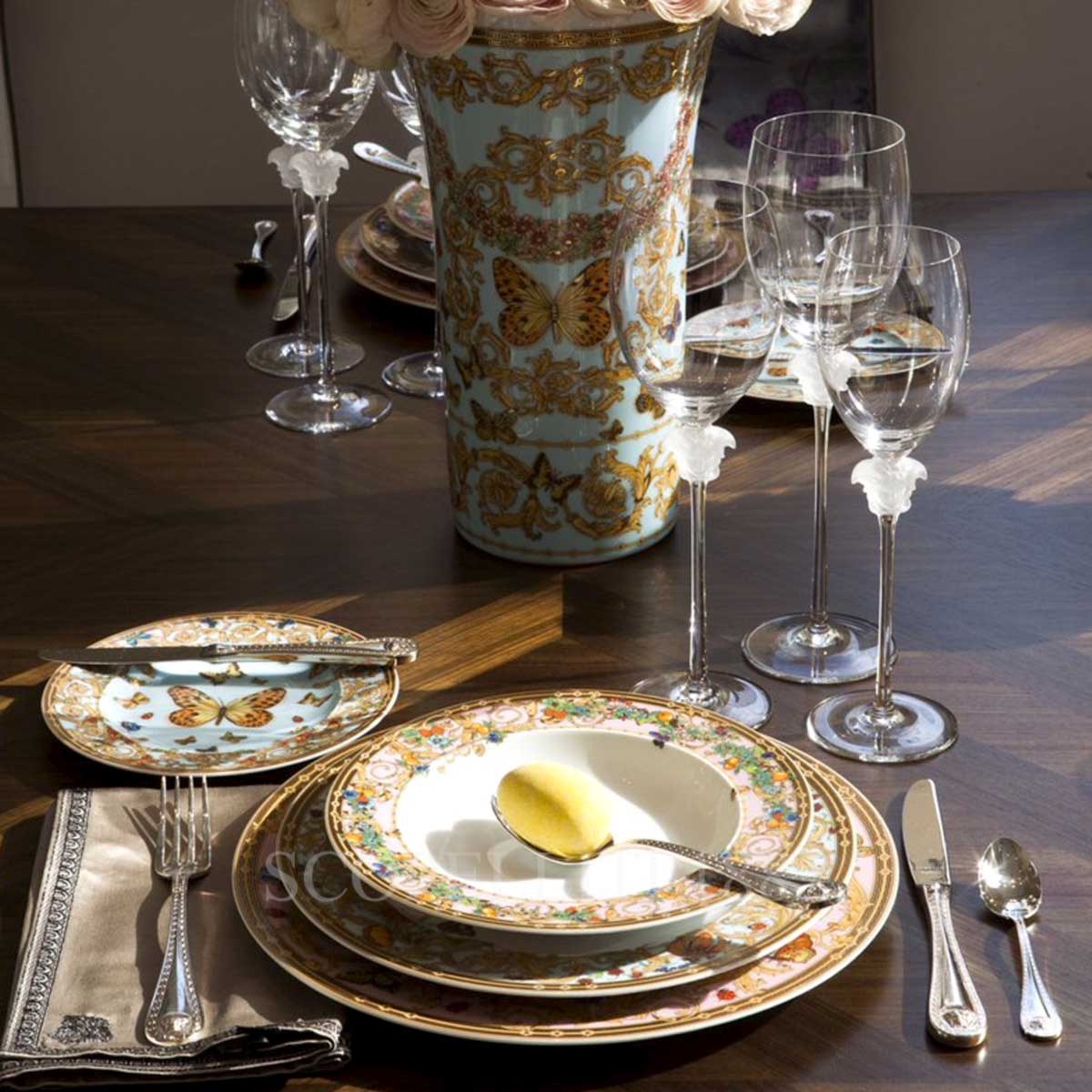 The Versace Butterfly Garden Dinner Plate boasts the enchanting Le Jardin de Versace design. Vibrant floral motifs, delicate butterflies, and intricate golden accents adorn this plate, creating a mesmerizing tableau inspired by the lush beauty of a garden in full bloom.