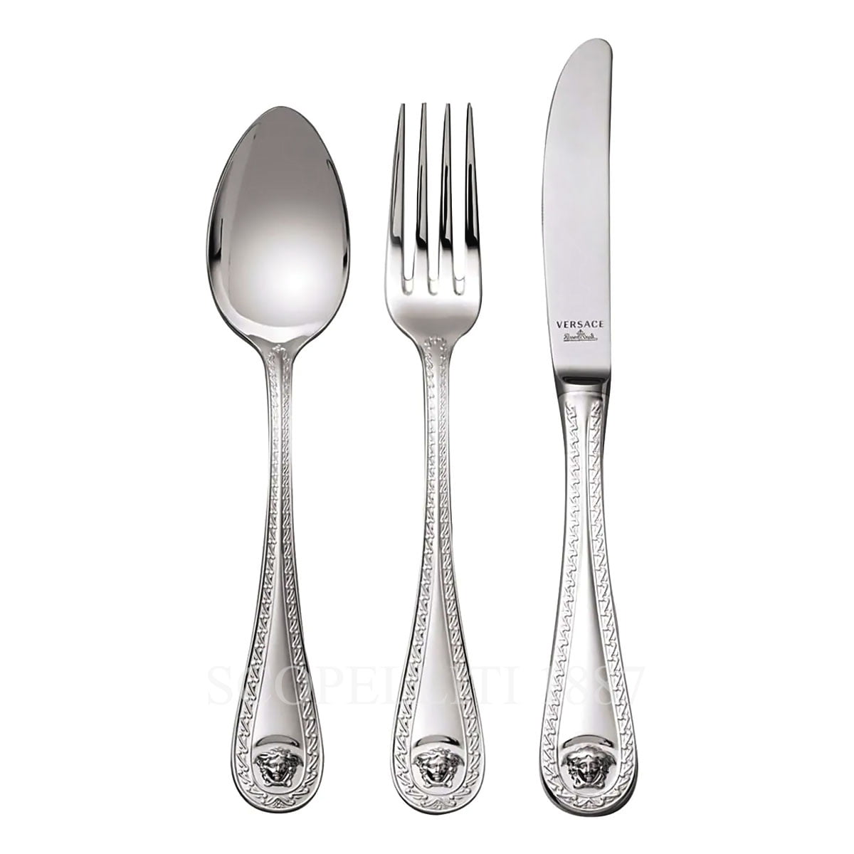 Designed for versatility, it glides smoothly through meats, poultry, and gourmet dishes, making every meal a luxurious affair. With its timeless design and impeccable quality, the Versace Dinner Knife Medusa Cutlery Silver Plated is a statement of prestige and fine taste. To maintain its brilliance, hand wash with mild soap, dry immediately, and avoid abrasive materials.