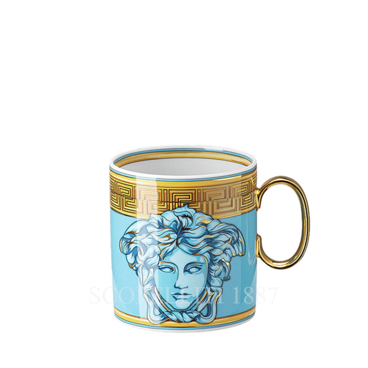 The Versace Mug with handle Medusa Amplified Blue Coin is a true testament to the brand’s dedication to luxury and craftsmanship. Made from high-quality porcelain, the mug features intricate detailing that highlights the brand’s iconic style, creating a perfect blend of elegance and functionality. The refined design of this mug makes it a standout piece in any tableware collection. Whether used for casual everyday use or special occasions, it adds a touch of sophistication to any setting. The mug can be seamlessly integrated into a larger dinner collection, enhancing both the aesthetic and experience of your meals.Â