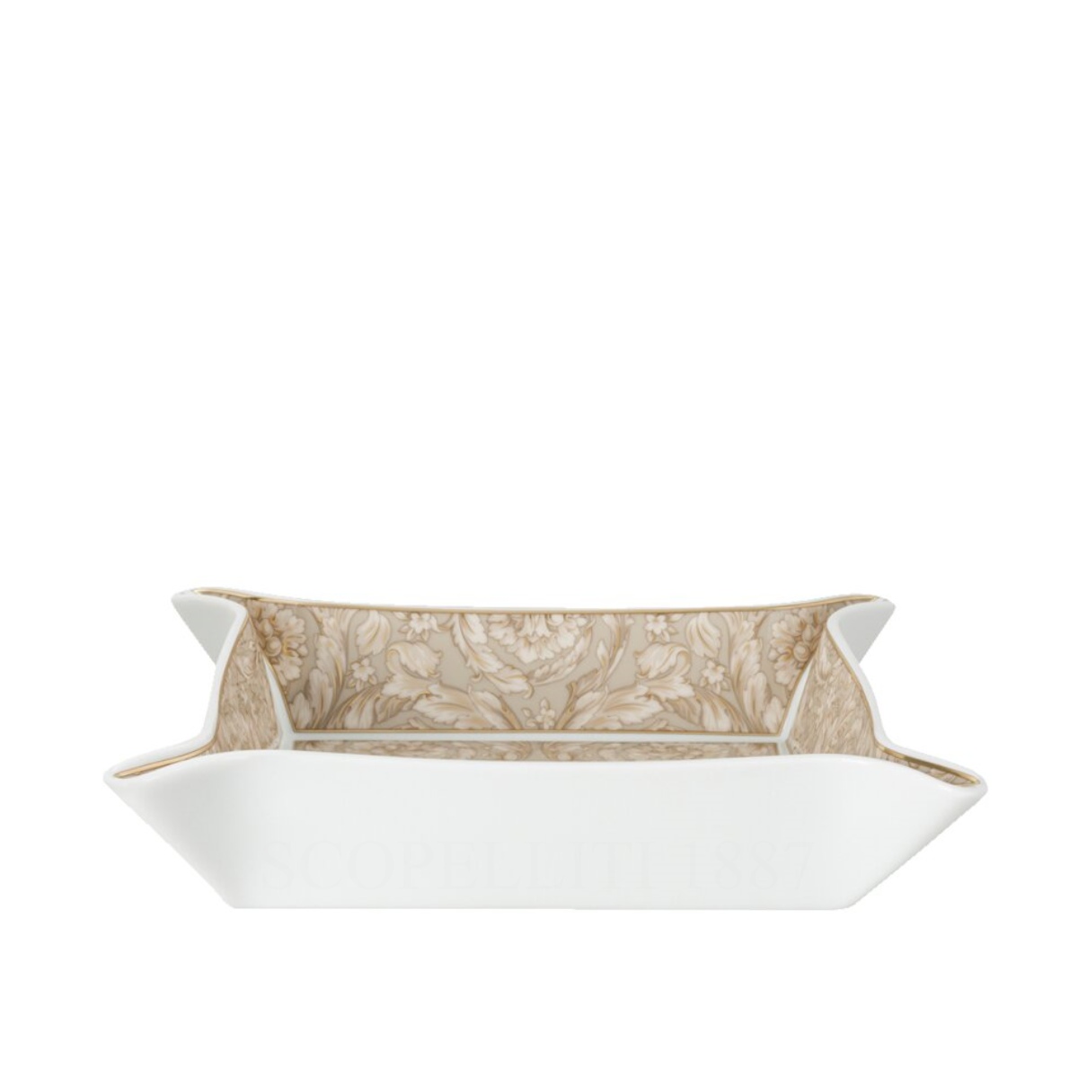The Versace Valet Tray Barocco Beige sizing 18 cm is a stunning accessory that seamlessly blends luxury with practicality. Crafted from premium calf leather, this piece showcases the iconic Barocco design, adding a touch of opulence to any space. Its neutral beige color exudes sophistication, making it a versatile addition to both classic and modern interiors.