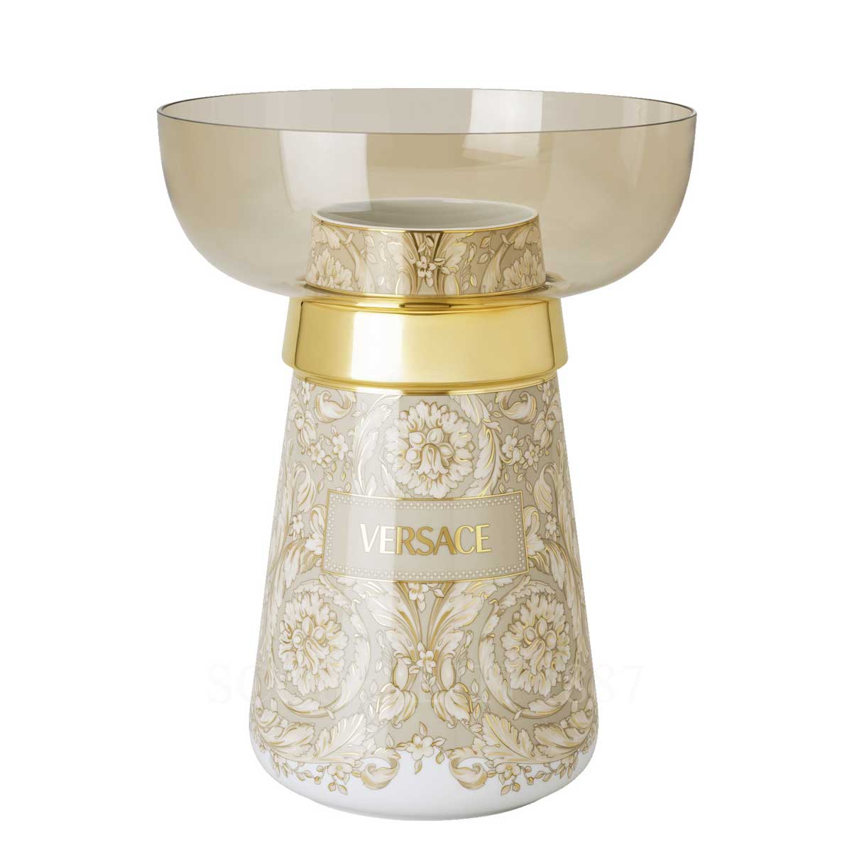 The refined porcelain and subtle beige tones, accented with delicate golden detailing, elevate the decor of any space, from living rooms to entryways. A hand-painted golden band encircles the Versace Vase Barocco Beige 38 cm, imparting a luxurious touch, while the amber-hued crystal glass bowl gracefully crowns each vase, adding sophistication to any floral arrangement. The two pieces fit together seamlessly with a silicone ring. The Versace Vase makes an exceptional gift for those who admire unique, high-end design, adding an element of timeless beauty and opulence to any collection.