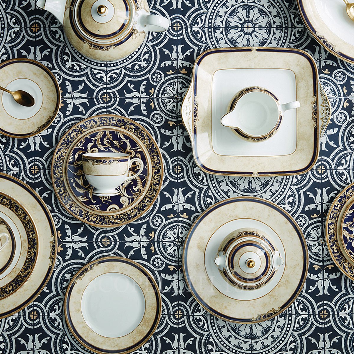 This Cornucopia 27cm Plate is inspired by the mythical ‘Horn of Plenty’ and adorned with legendary creatures such as unicorns and satyrs – a pattern for those who dare to be different. Crafted from silky white fine bone china for superior strength and a beautiful translucency, this plate is decorated with a wide band of ivory parchment and finished with rich navy, roped with an ochre accent and rimmed in lustrous 22-carat gold.