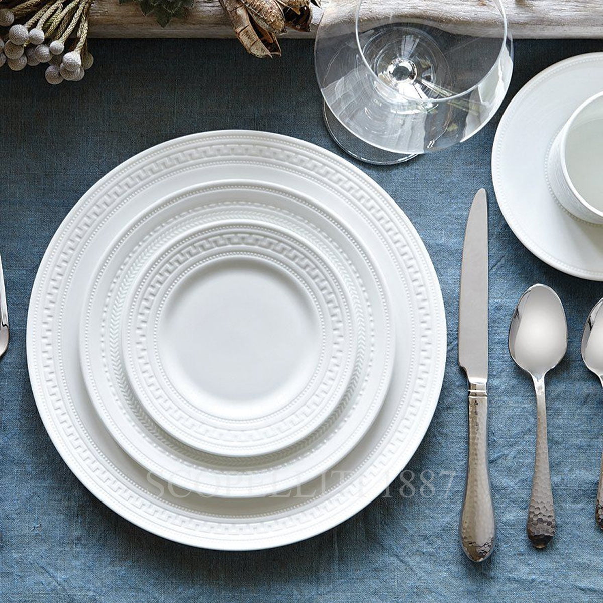 The “Intaglio” dinnerware from the English porcelain manufacturer Wedgwood is sophisticated, elegant, rich in variety and contemporary. A mixture of modern and classic style, the Intaglio pattern by Wedgwood has an embossed texture inspired by the Georgian era in fine bone china. Finished with contemporary angular lines, this deluxe collection will showcase your food and beverages in style. Contemporary meets classical with the Intaglio pattern, which combines the embossed textures so popular during the Georgian era with a clean, white glaze finish that is unmistakably modern. Beautiful white, fine bone china embossed with patterns inspired by knurling and engine turning – results in a aesthetically delightful, tactile finish. The intricately sculptured surface of the fine porcelain is not only captivating to the eye, but also has lush tactile appeal. The items making up Wedgwood‘s “Intaglio” fine bone china dinnerware bring together variations on classical décor motifs. A modern-day tribute to the early era of porcelain manufacture.