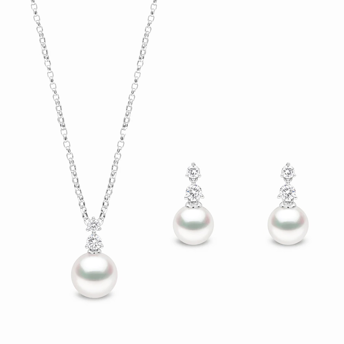 The Yoko London Akoya Pearl Diamond Gift Set includes a beautifully coordinated necklace with a delicate pendant and a matching pair of earrings. Each piece is expertly crafted in white 18K gold, showcasing luminous Akoya pearls and brilliant-cut diamonds for a look of timeless elegance.